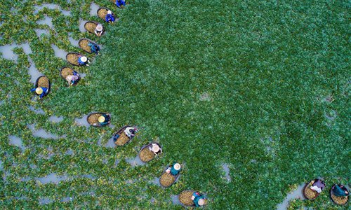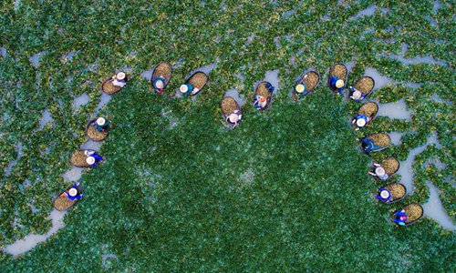Aerial photo taken on Sept. 28, 2017 shows local villagers picking water chestnuts in Xinghuo Village of Wuxing District in Huzhou, east China's Zhejiang Province. (Xinhua/Xu Yu)