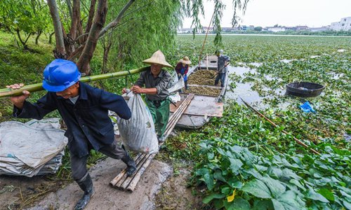 Local villagers bag water chestnuts in Xinghuo Village of Wuxing District in Huzhou, east China's Zhejiang Province, Sept. 28, 2017. (Xinhua/Xu Yu)