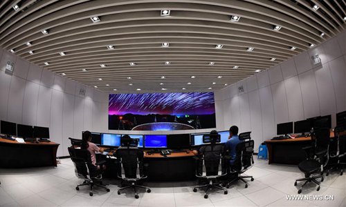 Staff members work in the control room of the Five-hundred-meter Aperture Spherical Telescope (FAST) in Pingtang County, southwest China's Guizhou Province, Aug. 9, 2017. The China-based FAST, the world's largest single-dish radio telescope, has identified two pulsars after one year of trial operation, the National Astronomical Observatories of China (NAOC) said on Oct. 10, 2017. Photo: Xinhua