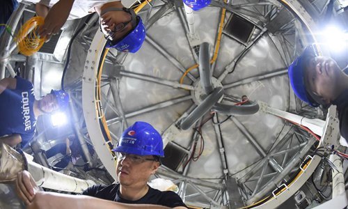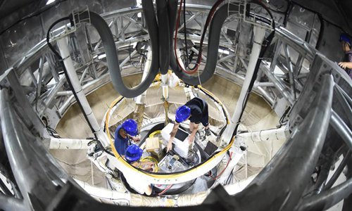 Staff members work in the feedback source cabin of the Five-hundred-meter Aperture Spherical Telescope (FAST) in Pingtang County, southwest China's Guizhou Province, Aug. 10, 2017. The China-based FAST, the world's largest single-dish radio telescope, has identified two pulsars after one year of trial operation, the National Astronomical Observatories of China (NAOC) said on Oct. 10, 2017.Photo: Xinhua
