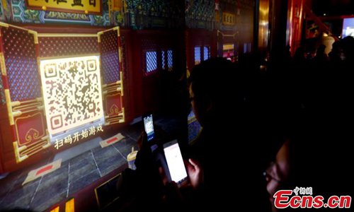 Visitors can scan a QR code to participate in a game at the exhibition in the Palace Museum. (Photo: China News Service/Du Yang)