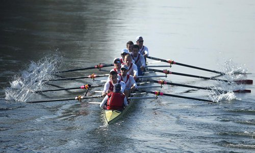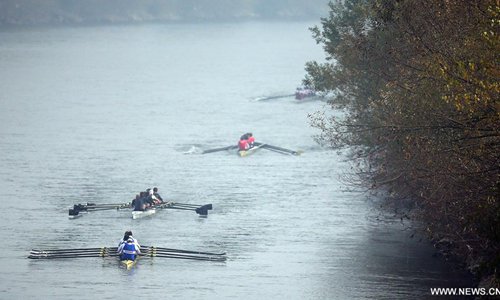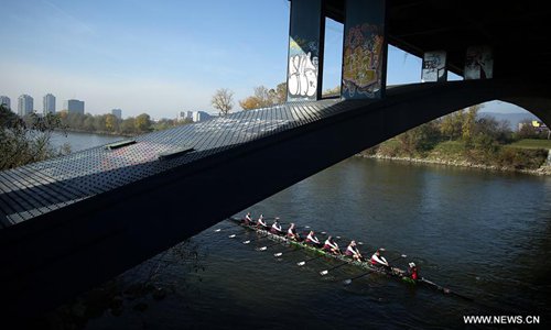 Rowers compete during the 3700-metre-long 2017 Eights on Sava rowing race organized by Croatian Academic Rowing Club Mladost in Zagreb, Croatia, Nov. 4, 2017. (Xinhua/Goran Stanzl)