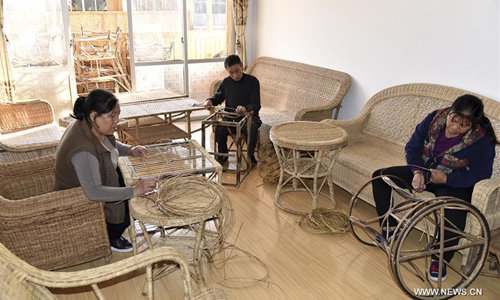 Villager Wu Shiwei weaves bamboo table at home in Banqiao Town of Zunyi City, southwest China's Guizhou Province, Nov. 8, 2017. Bamboo weaving industry has a history of over 50 years in the town. (Xinhua/Luo Xinghan)