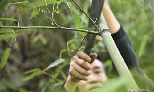 Villager Ma Tianzhi cut bamboo on mountain in Banqiao Town of Zunyi City, southwest China's Guizhou Province, Nov. 8, 2017. Bamboo weaving industry has a history of over 50 years in the town. (Xinhua/Luo Xinghan)