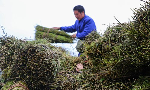 Bunches of the medicinal herb cat's claw are loaded for sale in Jianhe county, Southwest China's Guizhou Province on Monday. The county is the largest cultivation base for cat's claw in Guizhou, with a planting area of 100,000 mu (6,667 hectares). Since 2003, the government of Jianhe has encouraged local farmers to plant the herb to expand their income. Photo: VCG