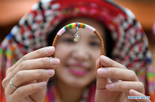 A woman displays an accessory of the Yao ethnic group in the Babu District of Hezhou, south China's Guangxi Zhuang Autonomous Region, Dec. 5, 2017. With distinctive regional features, costumes of the Yao ethnic group were enlisted as national intangible cultural heritage in 2006. (Xinhua/Lu Boan)