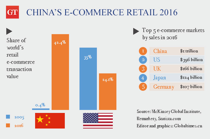 China's e-commerce retail over 40% of global market in 2016, doubles US