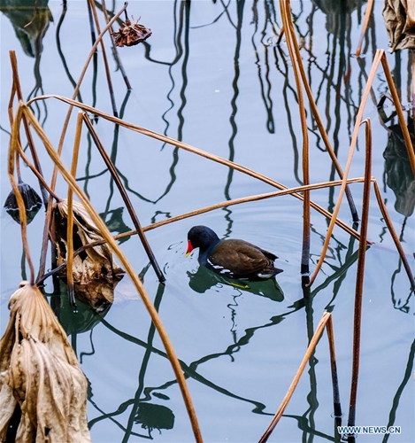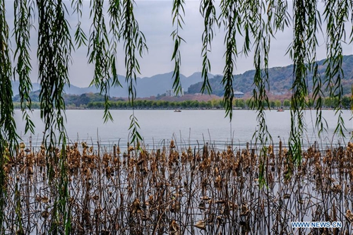 Withered lotus are seen at the West Lake scenic spot in Hangzhou, capital of east China's Zhejiang Province, Dec. 13, 2017. (Xinhua/Xu Yu)