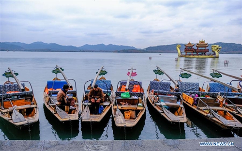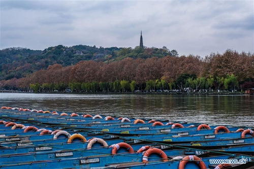 Photo taken on Dec. 13, 2017 shows the boats at the West Lake scenic spot in Hangzhou, capital of east China's Zhejiang Province. (Xinhua/Xu Yu)
