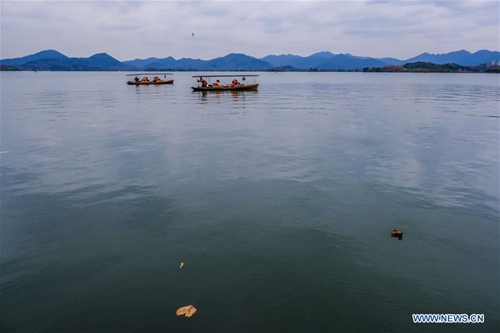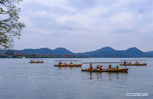 Tourists sail in the West Lake scenic spot in Hangzhou, capital of east China's Zhejiang Province, Dec. 13, 2017. (Xinhua/Xu Yu)