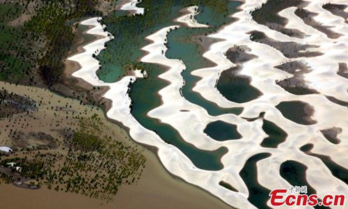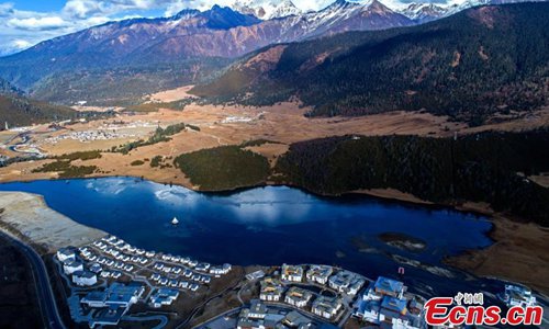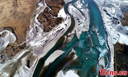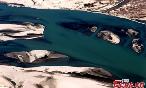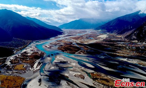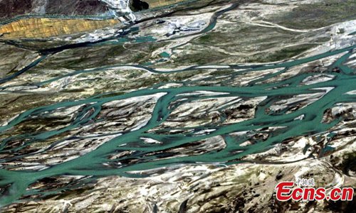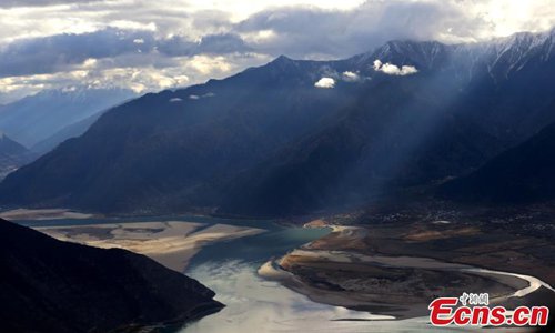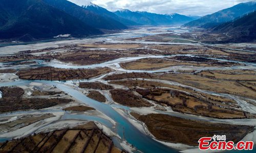 The photo shows an aerial view of mountains and Yarlung Zangbo River in southwest China's Tibet Autonomous Region. (Photo: China News Service/ Yang Jian)