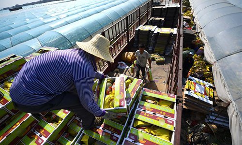 Workers transport honeydew melons in Foluo Town of Ledong County, south China's Hainan Province, Dec. 9, 2017. The total sales of Ledong County increased from 800 million of last year to 1.8 billion Yuan during the Hainan International Winter Trade Fair of Tropical Agricultural Products among which honeydew melons account for 730 million Yuan. Photo: Xinhua