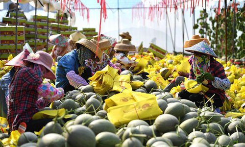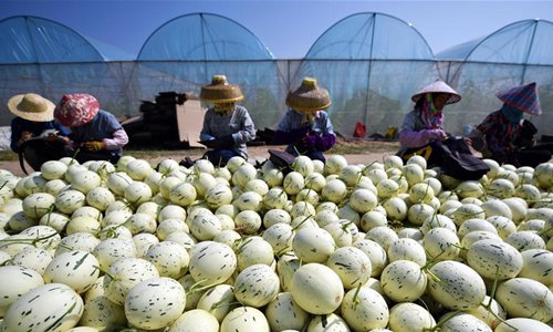 Farmers package honeydew melons in Foluo Town of Ledong County, south China's Hainan Province, Dec. 9, 2017. The total sales of Ledong County increased from 800 million of last year to 1.8 billion Yuan during the Hainan International Winter Trade Fair of Tropical Agricultural Products among which honeydew melons account for 730 million Yuan. Photo: Xinhua