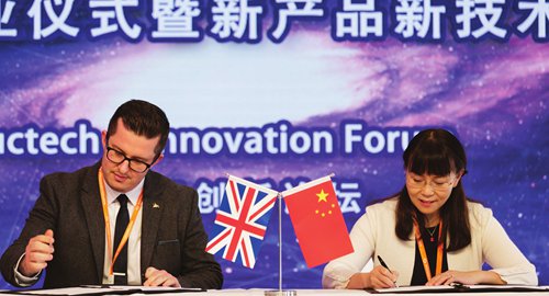 Zhang Li (right), chief engineer from Nuctech, signs deals with a representative of a famous airport in UK. Photo: Zhang Liang/GT