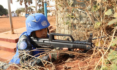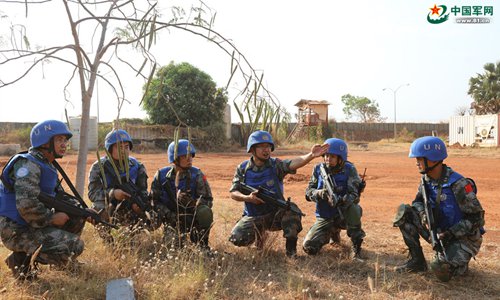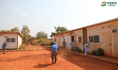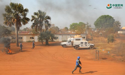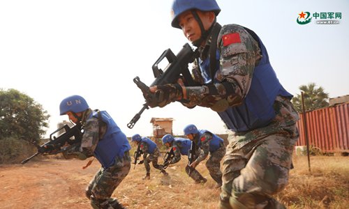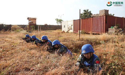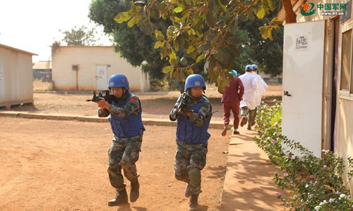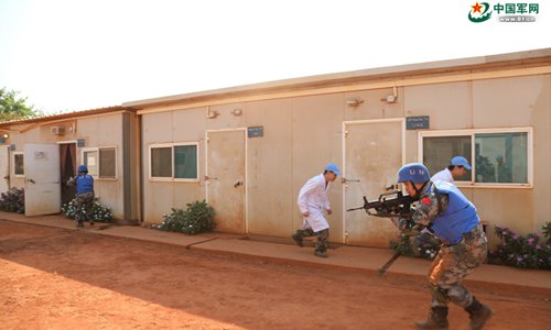 Guards from China’s South Sudan peacekeeping medical detachment participate in a drill in South Sudan on December 22, 2017. (Photo: Liu Mingli)