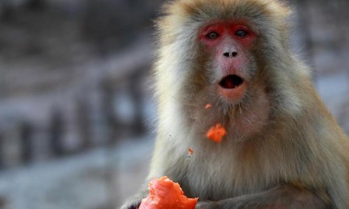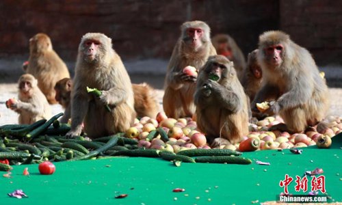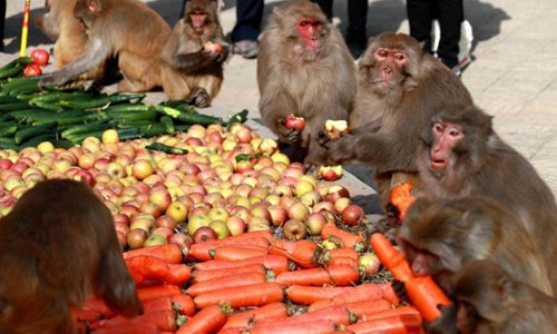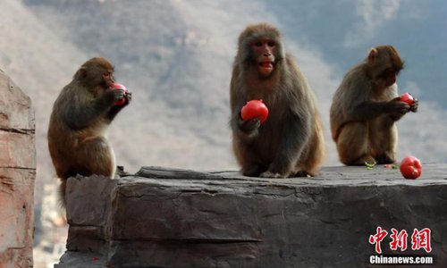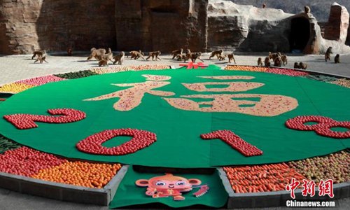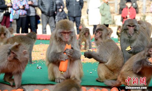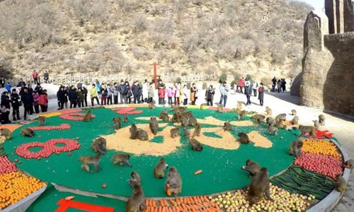 Wild macaques enjoy the New Year treat at a nature reserve in Jiyuan City, Central China’s Henan Province, Dec. 31, 2017. Grains and fruits were used to form Chinese character Fu, meaning fortune or good luck, in a circle with a diameter of 12 meters to give the local monkey population something to celebrate. (Photo: China News Service/Wang Zhongju)