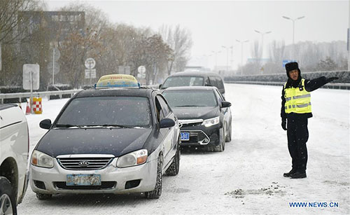 The police direct traffic amid snow at an expressway entrance in Yinchuan, capital of northwest China's Ningxia Hui Autonomous Region, Jan. 4, 2018. Many places across China saw snowfall from Wednesday. (Xinhua/Wang Peng)