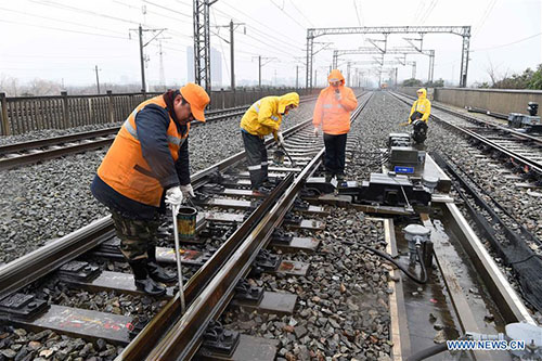 Railway staff members coat the rail with antifreeze in Wuhan, capital of central China's Hubei Province, Jan. 4, 2018. Many places across China saw snowfall from Wednesday. (Xinhua/Zhao Jun)