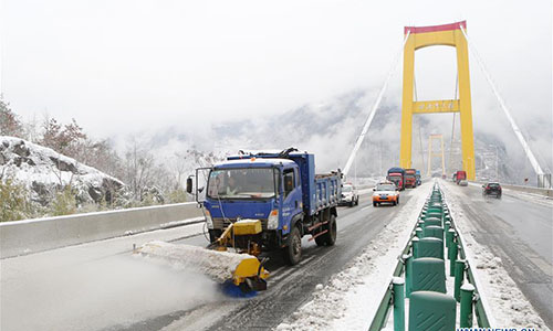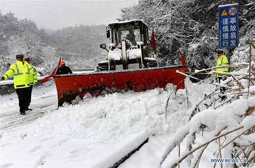 A snow grader cleans up snow on a dangerous road in Nanzhang County, central China's Hubei Province, Jan. 4, 2018. Many places across China saw snowfall from Wednesday. (Xinhua/Xiong Mingyin)