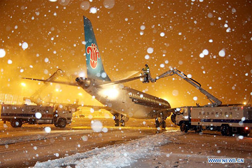 Staff members at Changzhou Airport remove ice from the plane in Changzhou, east China's Jiangsu Province, Jan. 4, 2018. Many places across China saw snowfall from Wednesday. (Xinhua/Chen Wei)