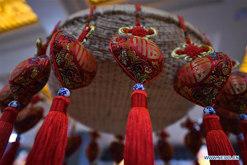 Photo taken on Jan. 17, 2018 shows herbal sachets at a workshop in the wetland park of Pan'anhu lake, in Xuzhou, east China's Jiangsu Province. Wang, an 80-year-old craftswoman is renowned for making herbal sachets. Combining tradition with bold innovation, many of her works were granted with prizes and gained widespread reputation for her. Her hand-made works were labeled as masterpieces of Xuzhou scented sachets, a national intangible cultural heritage. Under the guidance of Wang, hundreds of local women started to make sachets to increase their income. (Xinhua/Ji Chunpeng)