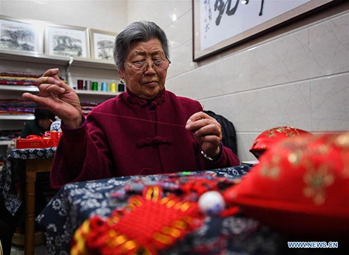 Wang Xiuying makes a herbal sachet at a workshop in the wetland park of Pan'anhu lake, in Xuzhou, east China's Jiangsu Province, Jan. 17, 2018. Wang, an 80-year-old craftswoman is renowned for making herbal sachets. Combining tradition with bold innovation, many of her works were granted with prizes and gained widespread reputation for her. Her hand-made works were labeled as masterpieces of Xuzhou scented sachets, a national intangible cultural heritage. Under the guidance of Wang, hundreds of local women started to make sachets to increase their income. (Xinhua/Ji Chunpeng)