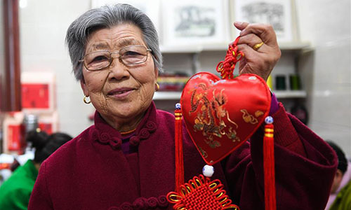 Wang Xiuying displays a herbal sachet at a workshop in the wetland park of Pan'anhu lake, in Xuzhou, east China's Jiangsu Province, Jan. 17, 2018. Wang, an 80-year-old craftswoman is renowned for making herbal sachets. Combining tradition with bold innovation, many of her works were granted with prizes and gained widespread reputation for her. Her hand-made works were labeled as masterpieces of Xuzhou scented sachets, a national intangible cultural heritage. Under the guidance of Wang, hundreds of local women started to make sachets to increase their income. (Xinhua/Ji Chunpeng)