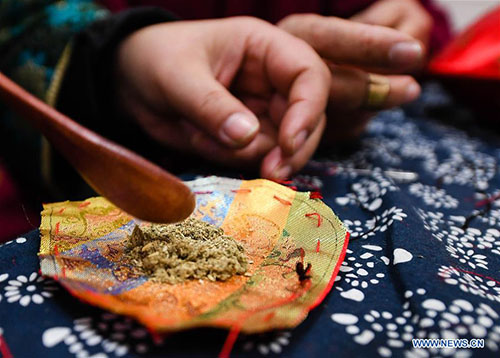 Sun Zhuozhen, daughter of Wang Xiuying makes a herbal sachet at a workshop in the wetland park of Pan'anhu lake, in Xuzhou, east China's Jiangsu Province, Jan. 17, 2018. Wang, an 80-year-old craftswoman is renowned for making herbal sachets. Combining tradition with bold innovation, many of her works were granted with prizes and gained widespread reputation for her. Her hand-made works were labeled as masterpieces of Xuzhou scented sachets, a national intangible cultural heritage. Under the guidance of Wang, hundreds of local women started to make sachets to increase their income. (Xinhua/Ji Chunpeng)