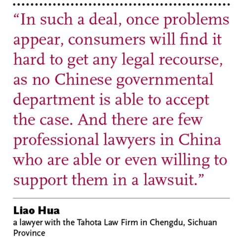 "In such a deal, once problems appear, consumers will find it hard to get any legal recourse, as no Chinese governmental department is able to accept the case. And there are few professional lawyers in China who are able or even willing to support them in a lawsuit," said Liao told the Global Times.