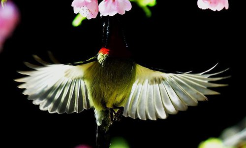 A bird flies amid cherry blossoms in Fuzhou, capital of southeast China's Fujian Province, Feb. 12, 2018. (Xinhua/Mei Yongcun)