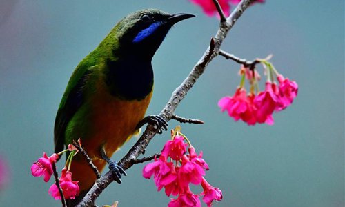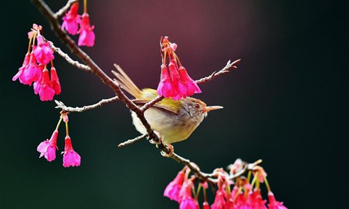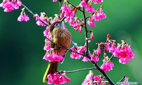 A bird rests on the branch of cherry blossoms in Fuzhou, capital of southeast China's Fujian Province, Feb. 12, 2018. (Xinhua/Mei Yongcun)