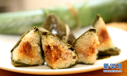 Sticky rice dumplings (zongzi): While most Chinese eat them to mark the Dragon Boat Festival (usually falls near summer solstice), zongzi - glutinous rice dumplings steamed in bamboo leaves – are a traditional Spring Festival food in southern China. Photo: Xinhua
