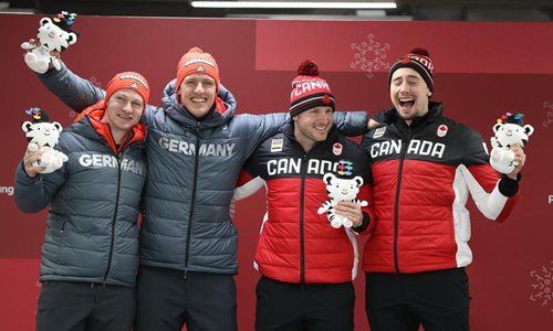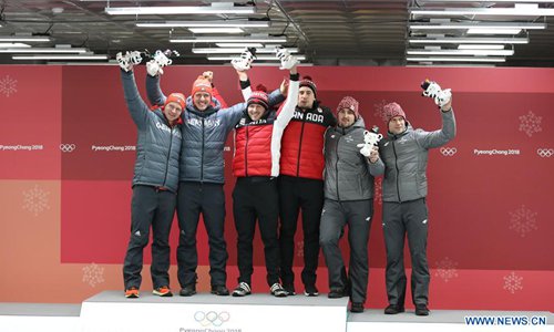 Gold medalists Germany's Johannes Lochner and Christopher Weber, Canada's Justin Kripps and Alexander Kopacz, bronze medalists Latvia's Oskars Melbardis and Janis Strenga (L to R) pose for photos during venue ceremony of 2-man event of bobsleigh at the 2018 PyeongChang Winter Olympic Games at Olympic Sliding Centre, PyeongChang, South Korea, Feb. 19, 2018. (Xinhua/Bai Xuefei)
