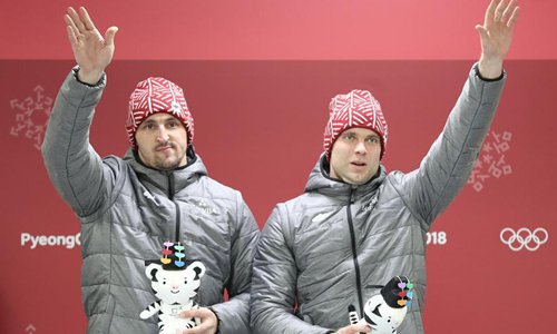 Bronze medalists Latvia's Oskars Melbardis (L) and Janis Strenga pose for photos during venue ceremony of 2-man event of bobsleigh at the 2018 PyeongChang Winter Olympic Games at Olympic Sliding Centre, PyeongChang, South Korea, Feb. 19, 2018. Oskars Melbardis and Janis Strenga claimed third place in a time of 3:16.91. (Xinhua/Bai Xuefei)