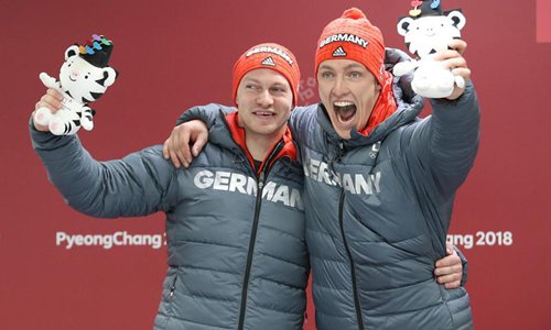 Gold medalists Germany's Johannes Lochner (L) and Christopher Weber celebrate during venue ceremony of 2-man event of bobsleigh at the 2018 PyeongChang Winter Olympic Games at Olympic Sliding Centre, PyeongChang, South Korea, Feb. 19, 2018. Johannes Lochner and Christopher Weber claimed champion, together with Canada's Justin Kripps and Alexander Kopacz, in a time of 3:16.86. (Xinhua/Bai Xuefei)
