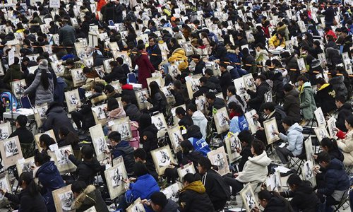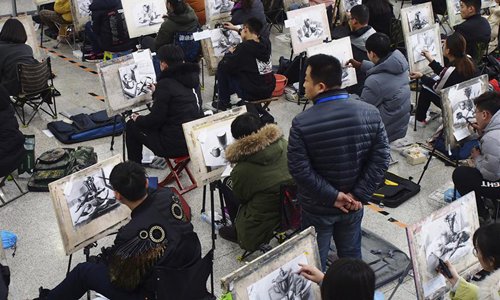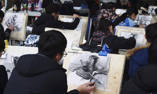 Students take part in the fine arts exam of Shandong University of Art & Design in Jinan, east China's Shandong Province, Feb. 24, 2018. The exam attracted over 6,000 students. Photo:Xinhua