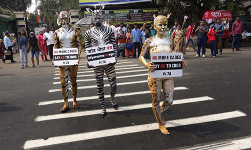 Activists of "People for Ethical Treatment of Animals" (PETA) with body painted as tiger, cheetah, and zebra carry placards demanding for "No More Cages, Say NO to Zoos" in front of the Aliopre Zoological Garden in Kolkata, India on Feb. 28, 2018. (Xinhua/Tumpa Mondal)