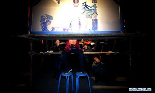 Folk artists play the shadow puppets at Yuxian Village in the Huazhou District of Weinan City, northwest China's Shaanxi Province, Feb. 28, 2018. Shadow puppet is one of the national intangible cultural heritages in China. (Xinhua/Liu Xiao)