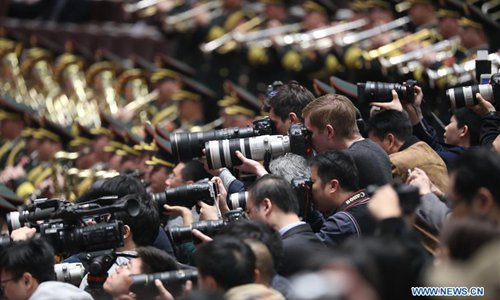 Journalists work at the closing meeting of the First Session of the 13th National Committee of the Chinese People's Political Consultative Conference (CPPCC) at the Great Hall of the People in Beijing, capital of China, March 15, 2018. (Xinhua/Xing Guangli)
