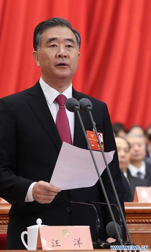 Wang Yang, a member of the Standing Committee of the Political Bureau of the Communist Party of China (CPC) Central Committee and chairman of the National Committee of the Chinese People's Political Consultative Conference (CPPCC), presides over the closing meeting of the First Session of the 13th CPPCC National Committee at the Great Hall of the People in Beijing, capital of China, March 15, 2018. (Xinhua/Pang Xinglei)