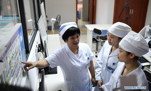 Du Liqun (L) speaks with nurses at the Fourth People's Hospital in Nanning, capital of south China's Guangxi Zhuang Autonomous Region, Sept. 18, 2017. Du Liqun is a nursing supervisor of AIDS department in the fourth people's hospital of Nanning. She has been stuck to her post ever since the AIDS department was founded in 2005. Apart from management works including the department's regulation making, recruitment and staff training, her major work is to take care of AIDS patients. Over the past years the number of patients she ever nursed exceeds 10,000. In 2015, she was awarded the Florence Nightingale Medal for outstanding contributions to health care. During her long-term medical practice, Du believes that a complete medical service system is indispensable to basic social security. In her spare time, she often provides free diagnosis for people in communities, raising their awareness of health. As a member of the 13th National Committee of the Chinese People's Political Consultative Conference (CPPCC), Du is dedicated to promotion of the primary medical service. She came to this year's CPPCC with a motion to improve medical staff's comprehensive ability of treating infectious diseases. (Xinhua/Lu Bo'an)
