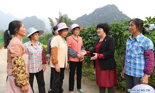 Du Liqun (2nd R) learns local medical conditions at Xindong Village of Bose City, south China's Guangxi Zhuang Autonomous Region, Nov. 14, 2017. Du Liqun is a nursing supervisor of AIDS department in the fourth people's hospital of Nanning. She has been stuck to her post ever since the AIDS department was founded in 2005. Apart from management works including the department's regulation making, recruitment and staff training, her major work is to take care of AIDS patients. Over the past years the number of patients she ever nursed exceeds 10,000. In 2015, she was awarded the Florence Nightingale Medal for outstanding contributions to health care. During her long-term medical practice, Du believes that a complete medical service system is indispensable to basic social security. In her spare time, she often provides free diagnosis for people in communities, raising their awareness of health. As a member of the 13th National Committee of the Chinese People's Political Consultative Conference (CPPCC), Du is dedicated to promotion of the primary medical service. She came to this year's CPPCC with a motion to improve medical staff's comprehensive ability of treating infectious diseases. (Xinhua/Lu Bo'an)