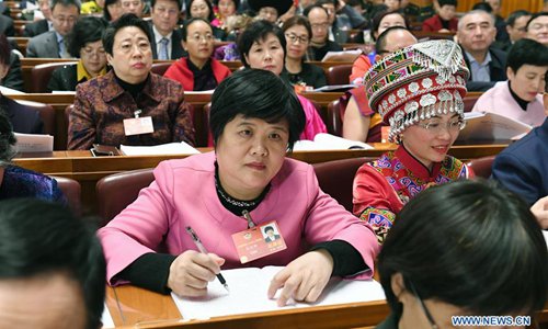 Du Liqun (L, front) attends the third plenary meeting of the first session of the 13th National Committee of the Chinese People's Political Consultative Conference (CPPCC) in Beijing, capital of China, March 10, 2018. Du Liqun is a nursing supervisor of AIDS department in the fourth people's hospital of Nanning. She has been stuck to her post ever since the AIDS department was founded in 2005. Apart from management works including the department's regulation making, recruitment and staff training, her major work is to take care of AIDS patients. Over the past years the number of patients she ever nursed exceeds 10,000. In 2015, she was awarded the Florence Nightingale Medal for outstanding contributions to health care. During her long-term medical practice, Du believes that a complete medical service system is indispensable to basic social security. In her spare time, she often provides free diagnosis for people in communities, raising their awareness of health. As a member of the 13th National Committee of the Chinese People's Political Consultative Conference (CPPCC), Du is dedicated to promotion of the primary medical service. She came to this year's CPPCC with a motion to improve medical staff's comprehensive ability of treating infectious diseases. (Xinhua/Yang Zongyou)