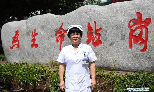 Du Liqun poses for photo in front of the Fourth People's Hospital in Nanning, capital of south China's Guangxi Zhuang Autonomous Region, Sept. 18, 2017. Du Liqun is a nursing supervisor of AIDS department in the fourth people's hospital of Nanning. She has been stuck to her post ever since the AIDS department was founded in 2005. Apart from management works including the department's regulation making, recruitment and staff training, her major work is to take care of AIDS patients. Over the past years the number of patients she ever nursed exceeds 10,000. In 2015, she was awarded the Florence Nightingale Medal for outstanding contributions to health care. During her long-term medical practice, Du believes that a complete medical service system is indispensable to basic social security. In her spare time, she often provides free diagnosis for people in communities, raising their awareness of health. As a member of the 13th National Committee of the Chinese People's Political Consultative Conference (CPPCC), Du is dedicated to promotion of the primary medical service. She came to this year's CPPCC with a motion to improve medical staff's comprehensive ability of treating infectious diseases. (Xinhua/Lu Bo'an)