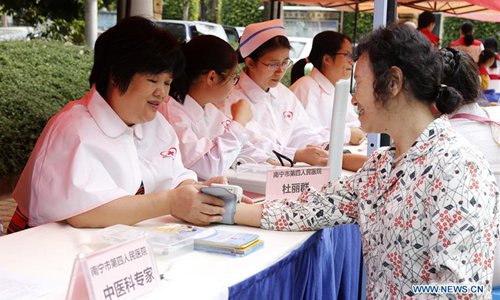 Du Liqun (1st L) measures blood pressure for residents during a free clinic event in Nanning, south China's Guangxi Zhuang Autonomous Region, Nov. 4, 2017. Du Liqun is a nursing supervisor of AIDS department in the fourth people's hospital of Nanning. She has been stuck to her post ever since the AIDS department was founded in 2005. Apart from management works including the department's regulation making, recruitment and staff training, her major work is to take care of AIDS patients. Over the past years the number of patients she ever nursed exceeds 10,000. In 2015, she was awarded the Florence Nightingale Medal for outstanding contributions to health care. During her long-term medical practice, Du believes that a complete medical service system is indispensable to basic social security. In her spare time, she often provides free diagnosis for people in communities, raising their awareness of health. As a member of the 13th National Committee of the Chinese People's Political Consultative Conference (CPPCC), Du is dedicated to promotion of the primary medical service. She came to this year's CPPCC with a motion to improve medical staff's comprehensive ability of treating infectious diseases. (Xinhua/Huang Yumei)