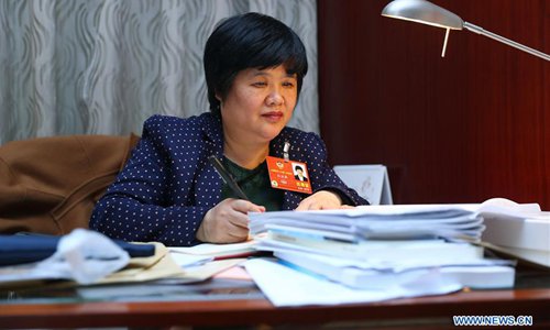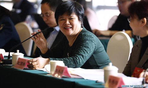 Du Liqun, a member of the 13th National Committee of the Chinese People's Political Consultative Conference (CPPCC), speaks during a panel discussion in Beijing, capital of China, March 12, 2018. Du Liqun is a nursing supervisor of AIDS department in the fourth people's hospital of Nanning. She has been stuck to her post ever since the AIDS department was founded in 2005. Apart from management works including the department's regulation making, recruitment and staff training, her major work is to take care of AIDS patients. Over the past years the number of patients she ever nursed exceeds 10,000. In 2015, she was awarded the Florence Nightingale Medal for outstanding contributions to health care. During her long-term medical practice, Du believes that a complete medical service system is indispensable to basic social security. In her spare time, she often provides free diagnosis for people in communities, raising their awareness of health. As a member of the 13th National Committee of the Chinese People's Political Consultative Conference (CPPCC), Du is dedicated to promotion of the primary medical service. She came to this year's CPPCC with a motion to improve medical staff's comprehensive ability of treating infectious diseases. (Xinhua/Zhang Yuwei)