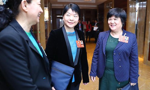 Du Liqun (R), a member of the 13th National Committee of the Chinese People's Political Consultative Conference (CPPCC), talks with other CPPCC members after a panel discussion in Beijing, capital of China, March 12, 2018. Du Liqun is a nursing supervisor of AIDS department in the fourth people's hospital of Nanning. She has been stuck to her post ever since the AIDS department was founded in 2005. Apart from management works including the department's regulation making, recruitment and staff training, her major work is to take care of AIDS patients. Over the past years the number of patients she ever nursed exceeds 10,000. In 2015, she was awarded the Florence Nightingale Medal for outstanding contributions to health care. During her long-term medical practice, Du believes that a complete medical service system is indispensable to basic social security. In her spare time, she often provides free diagnosis for people in communities, raising their awareness of health. As a member of the 13th National Committee of the Chinese People's Political Consultative Conference (CPPCC), Du is dedicated to promotion of the primary medical service. She came to this year's CPPCC with a motion to improve medical staff's comprehensive ability of treating infectious diseases. (Xinhua/Zhang Yuwei)