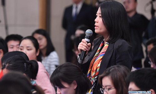 A journalist asks questions at a press conference on China's efforts on providing fair education of good quality on the sidelines of the first session of the 13th National People's Congress (NPC) in Beijing, capital of China, March 16, 2018. (Xinhua/Li Xin)