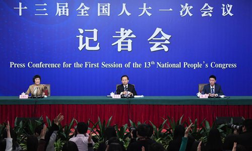 Chinese Minister of Environmental Protection Li Ganjie (C) takes questions at a press conference on the battle against pollution on the sidelines of the first session of the 13th National People's Congress (NPC) in Beijing, capital of China, March 17, 2018. Photo: Xinhua