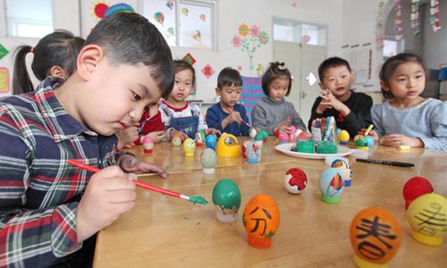 Children draw on eggs at a kindergarten in Zaoqiang County, north China's Hebei Province, March 21, 2018, also the day of "Chunfen". Chunfen, which literally means Spring Equinox or Vernal Equinox, falls on the day when the sun is exactly at the celestial latitude of zero degrees. (Xinhua/Zhu Xudong)